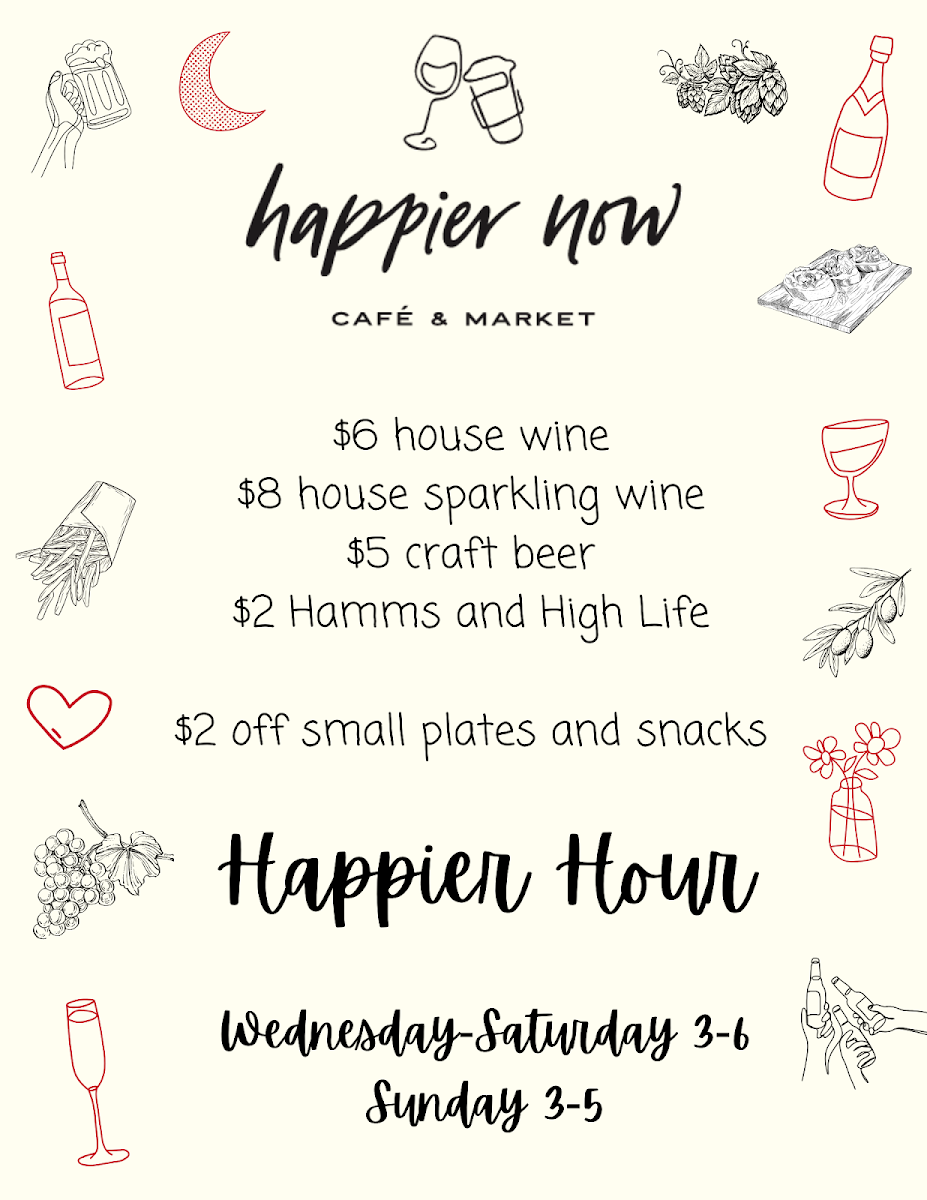 Bringing together everything the menu offers, Happier Now Cafe & Market presents a warm, well-rounded selection that feels both thoughtful and delightfully varied. From inviting small plates like All 3 (Olives, Nuts, Pickles), Baked Feta, BurrataCharcuterie, and Ham Crostini, to comforting soups such as Split Pea and Ham (GF DF) and Butternut Squash, the menu balances rustic charm with fresh, contemporary touches. Lighter options-including the Broccoli Caesar, Chilled Peanut Noodles, Greens and GrainsMixed Greens, and Brussels Sprout Salad-pair naturally with hearty sandwich staples like the Cheeseburger, Hummus, Roast Turkey BreastRoasted Beet, and Tuna. Dinner continues the homey yet elevated feel with satisfying entrées like Bratwurst, Maque Choux Risotto, Pork SchnitzelSalmon, and Shrimp and Grits, while breakfast favorites such as the Bagel, Bagel Sandwich, Croissant SandwichLox Sandwich, and Mushroom Toast round out the morning offerings. Even kids are well cared for, with approachable plates like Macaroni and Cheese, Chicken Tenders, Buttered Noodles, Buddy Fruits Apple Sauce, and Kids Crudite, plus drinks like Horizon Milk, Honest JuiceKids Citrusade, and Ripple Milk - Plant Based. Beverage choices span from Aqua Panna Spring Water, 1L and Citrus-Ade to Americano, Cold BrewCortado, Chai, Matcha, and Steamed Apple Cider. The attached market adds another layer of charm, offering everything from local beers like Alter Ambigram and BuckleDown Belts & Suspenders to wines such as Los Monteros NV Brut Metodo, Fossil & Fawn Pinot Noir 2023, Wander And Ivy Rose, and Halb Jahr Riesling, plus pantry goods like American Tuna, Dill Pickles, and Divina Fruit Spread, and even branded items like the Apron and Cat Bag. Altogether, the menu feels abundant, accessible, and thoughtfully curated-an experience that leaves diners with the sense that Happier Now truly lives up to its name.
